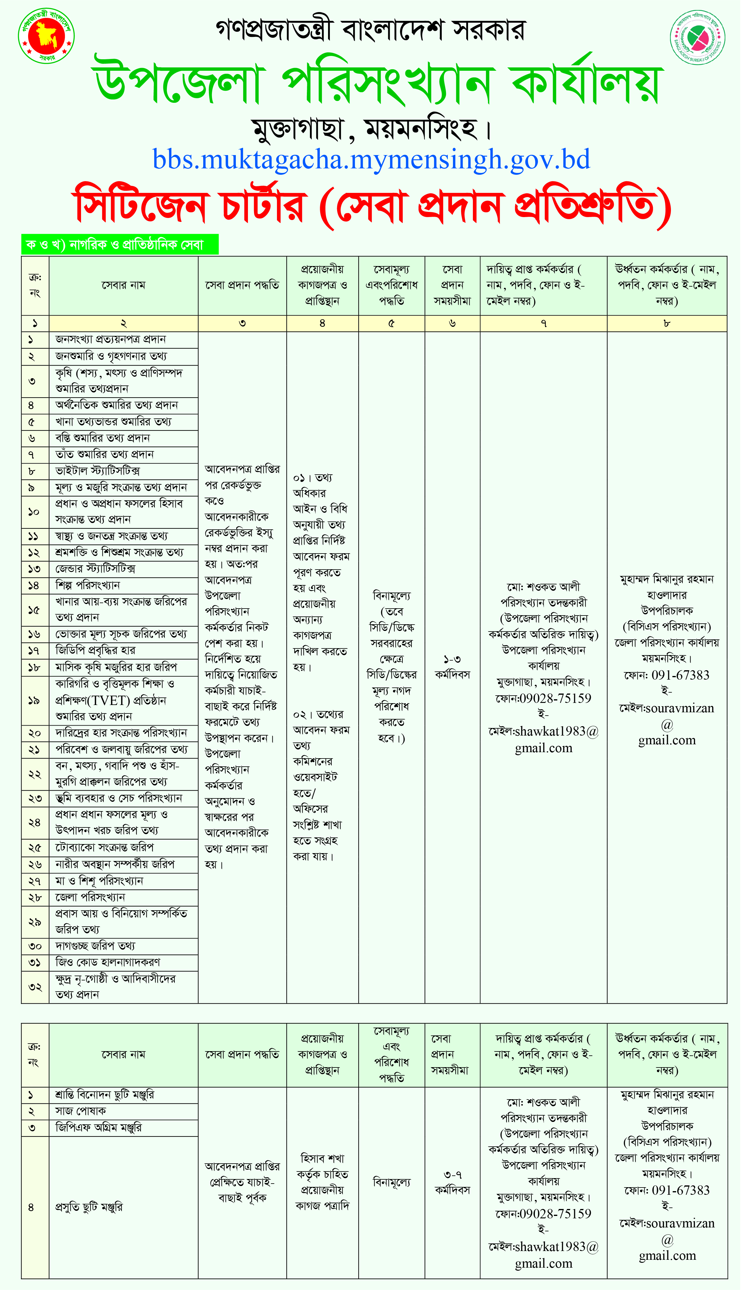 | ০১ | শ্রান্তি বিনোদন ছুটি মঞ্জুরি | আবেদনপত্র প্রাপ্তির প্রেক্ষিতে যাচাই- বাছাই পূর্বক | হিসাব শাখা কর্তৃক চাহিত প্রয়োজনীয় কাগজপত্রাদি | বিনামূল্যে | ৩-৭ কর্মদিবস | মো: শাহজাহান পরিসংখ্যান কর্মকর্তা উপজেলা পরিসংখ্যান অফিস মুক্তাগাছা, ময়মনসিংহ। ফোন-02996672994 ই-মেইল: usomuktagacha@gmail.com | মুহাম্মদ মিজানুর রহমান হাওলাদার উপ পরিচালক (বিসিএস পরিসংখ্যান) জেলা পরিসংখ্যান অফিস ময়মনসিংহ। ফোন: 091-67383 ই-মেইল: souravmizan@gmail.com